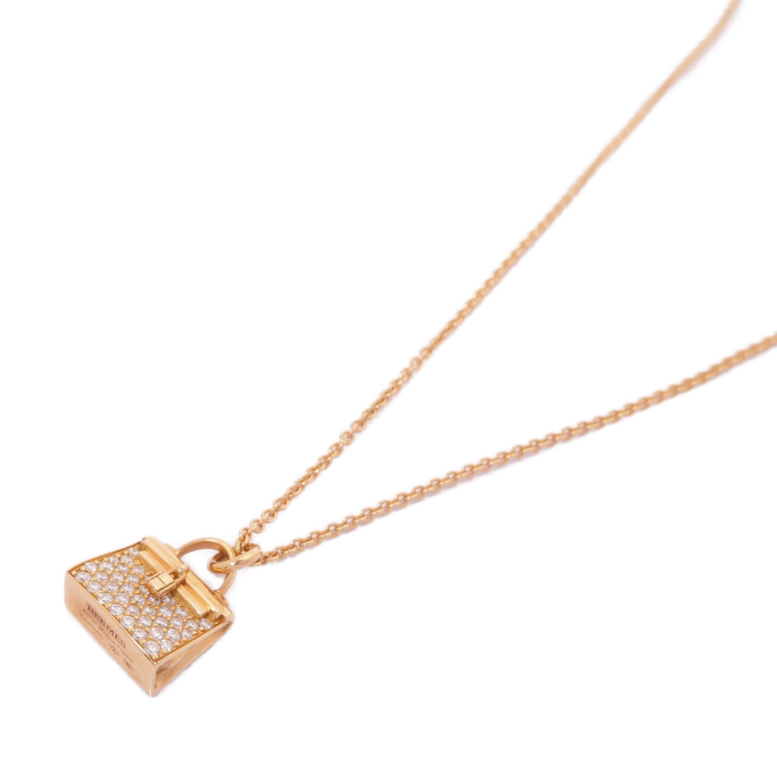 HERMES 18K玫瑰金Amulettes Kelly Pendant Necklace 0.39ct鑽石項鍊金色