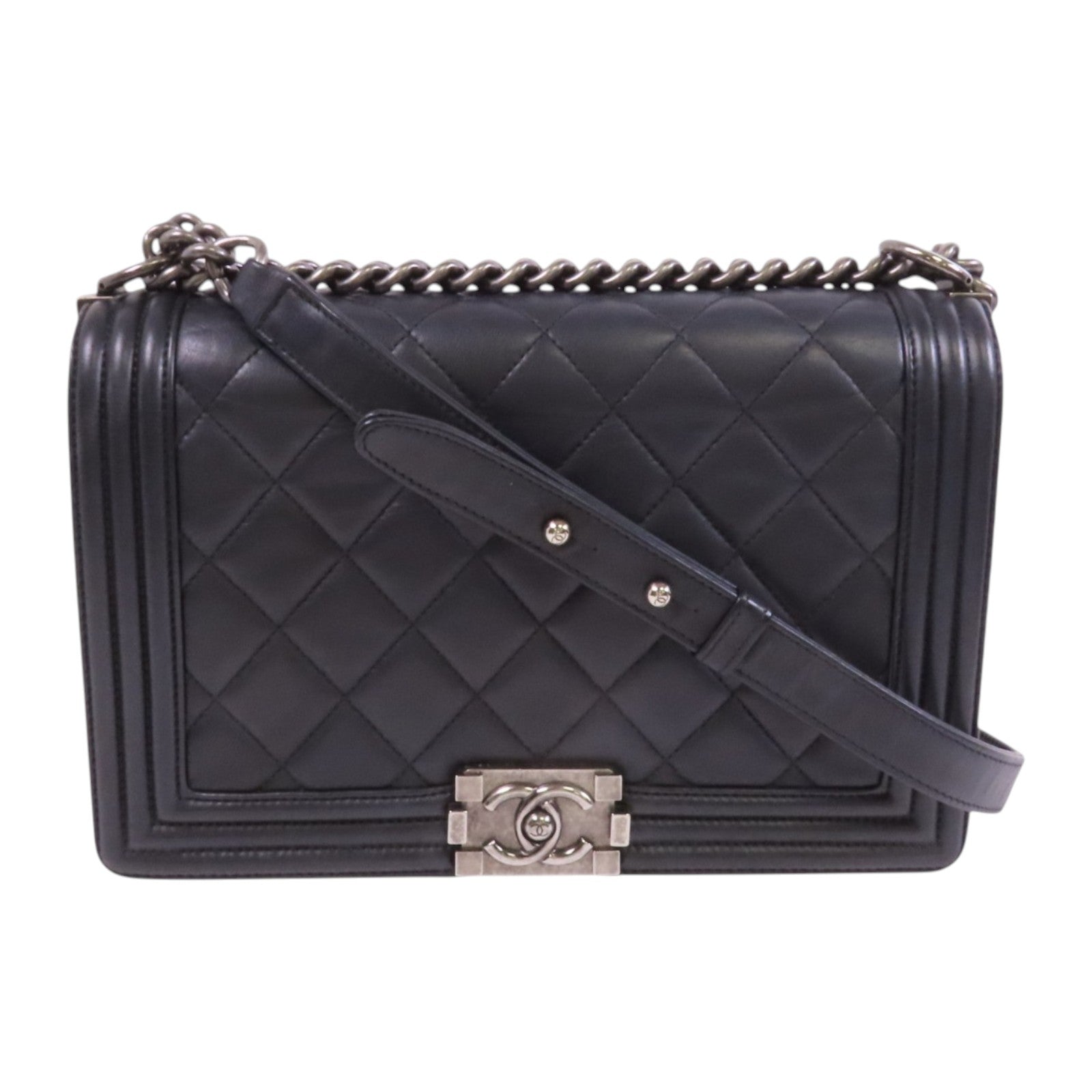 CHANEL 牛皮皮革Boy 28銀扣鏈帶肩背袋