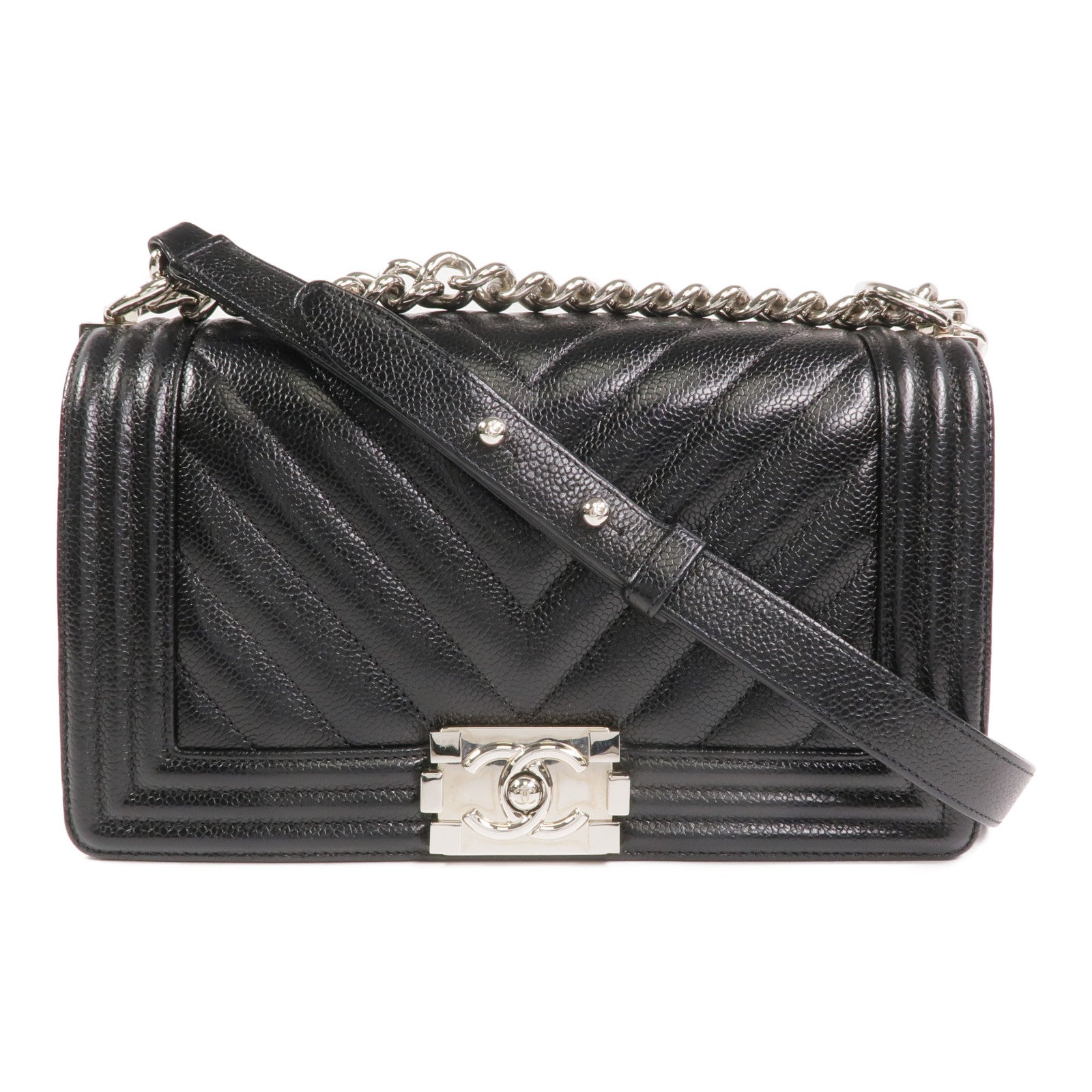 CHANEL 牛皮皮革Boy 25銀扣鏈帶肩背袋
