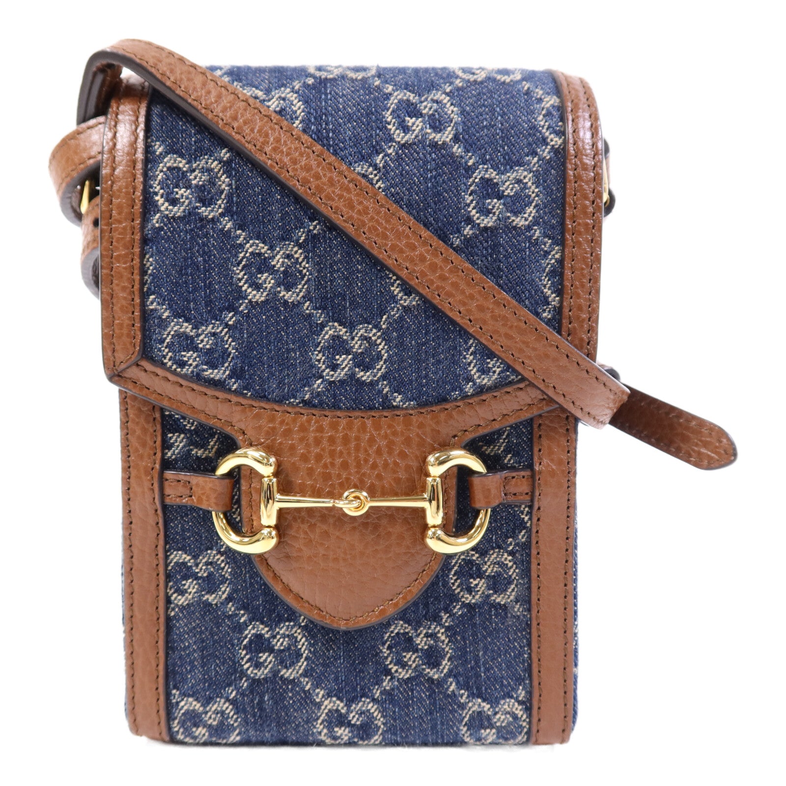 GUCCI 牛皮皮革/牛仔布Horsebit 1955 Mini金扣肩背袋