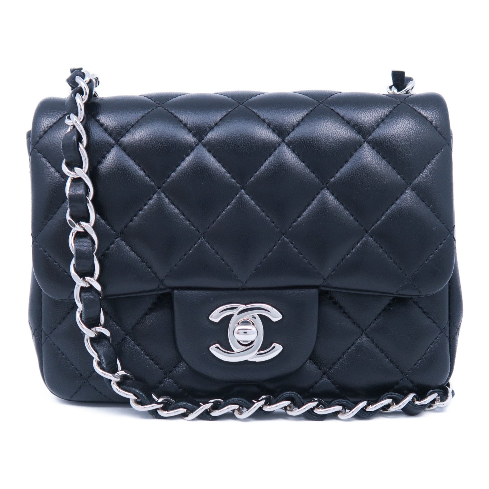 CHANEL 菱格羊皮皮革Mini Square銀扣鏈帶肩背袋黑色