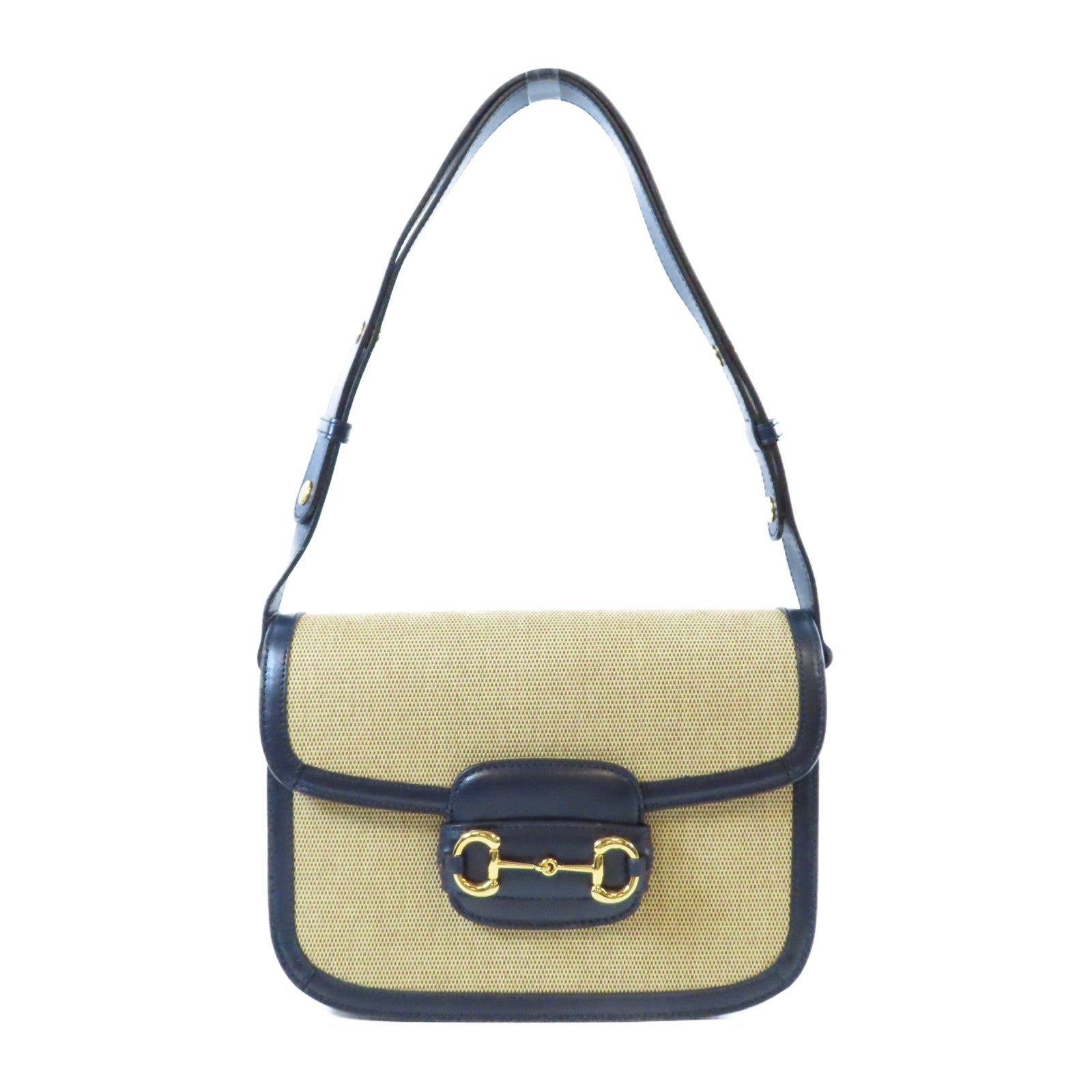 GUCCI 【激減優惠】帆布/皮革Horsebit 1955金扣肩背袋深藍色/米色