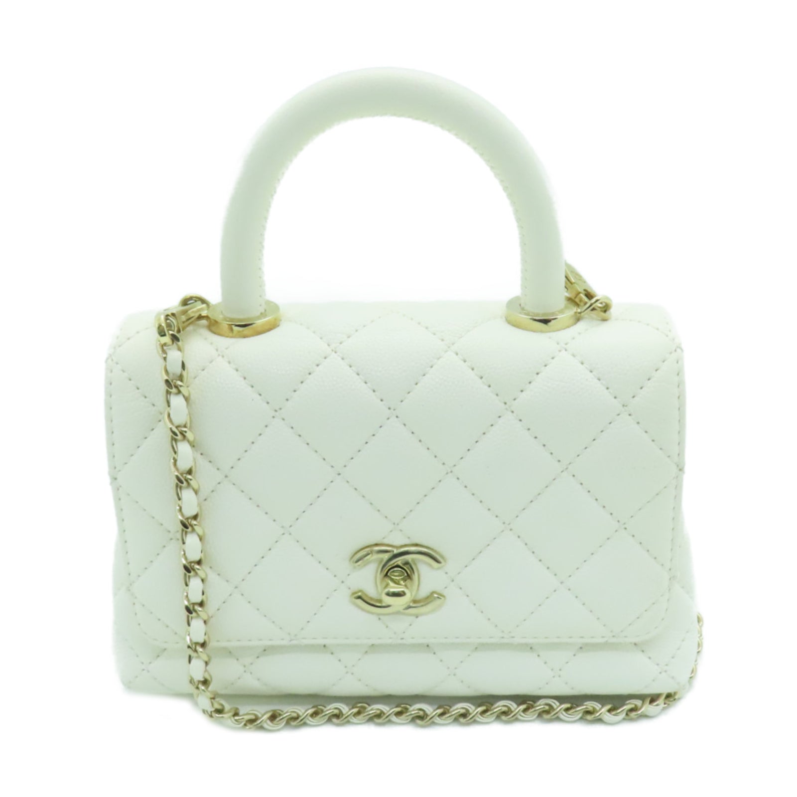 CHANEL 菱格Caviar皮革Mini Coco Handle金扣鏈帶肩背袋白色