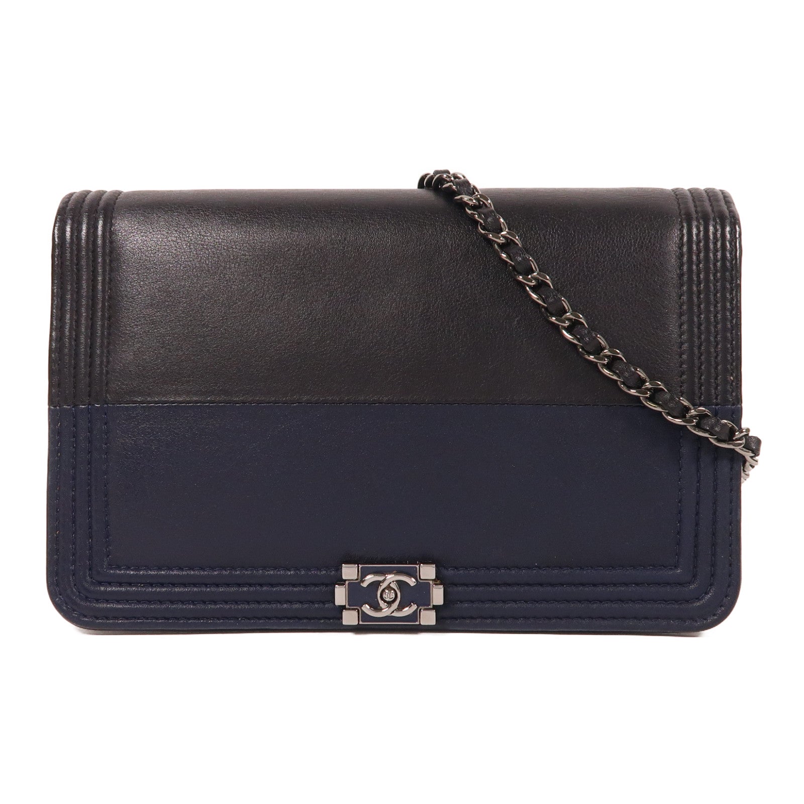 CHANEL 皮革WOC銀扣鏈帶肩背袋藍色/黑色