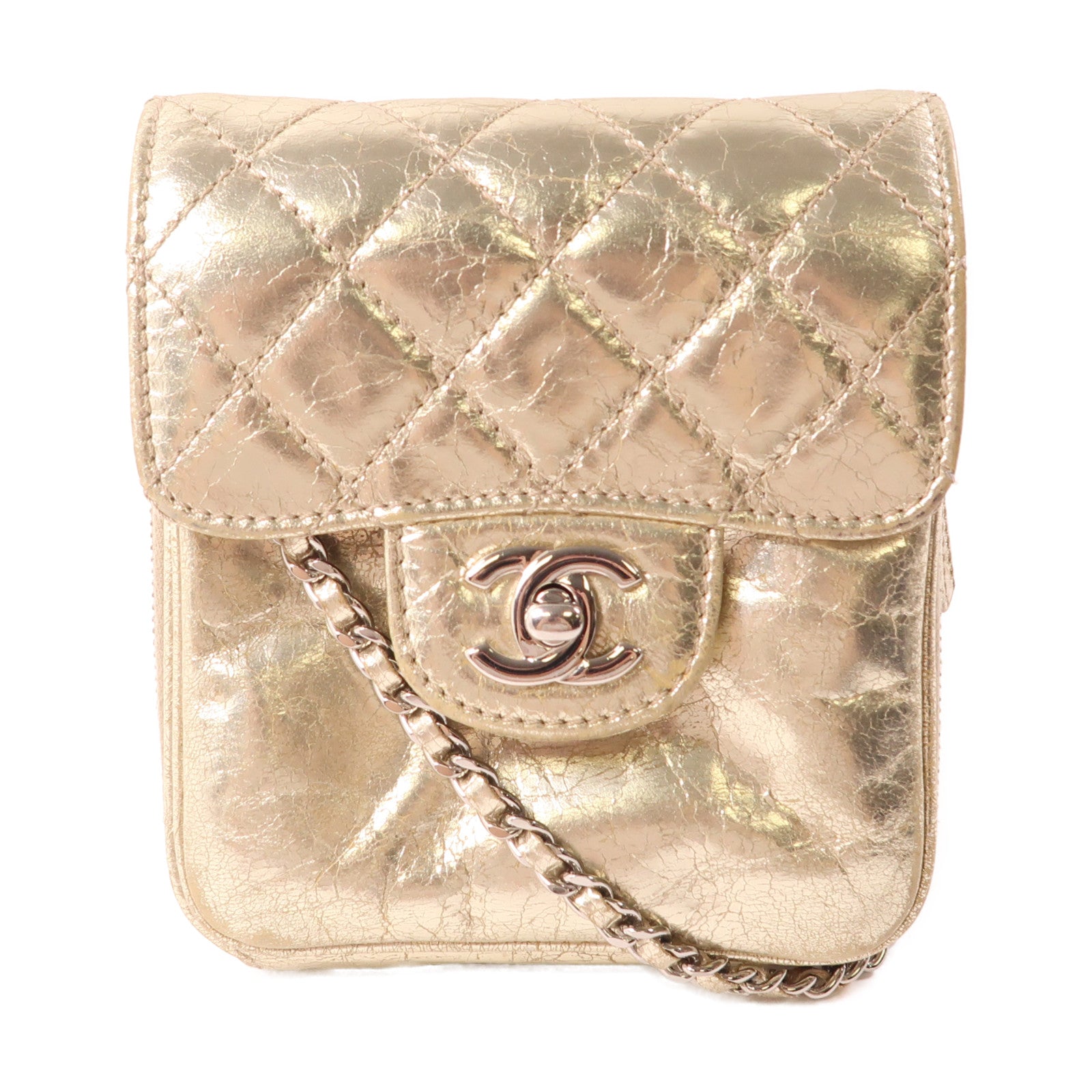 CHANEL 牛皮皮革Chain Shoulder銀扣鏈帶肩背袋金色