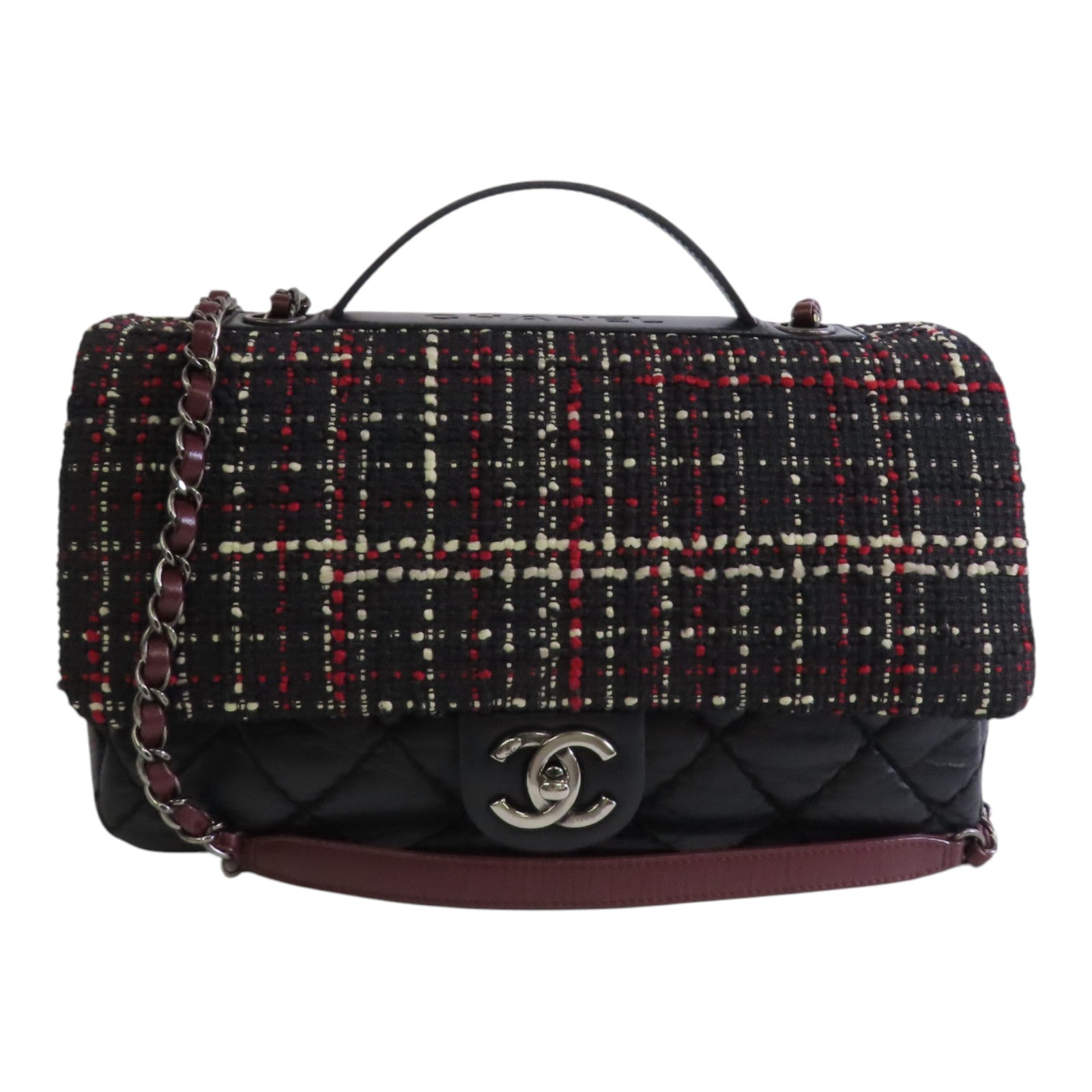 CHANEL 牛皮皮革/斜紋軟呢2Way Shoulder Bag銀扣鏈帶手挽肩背兩用袋