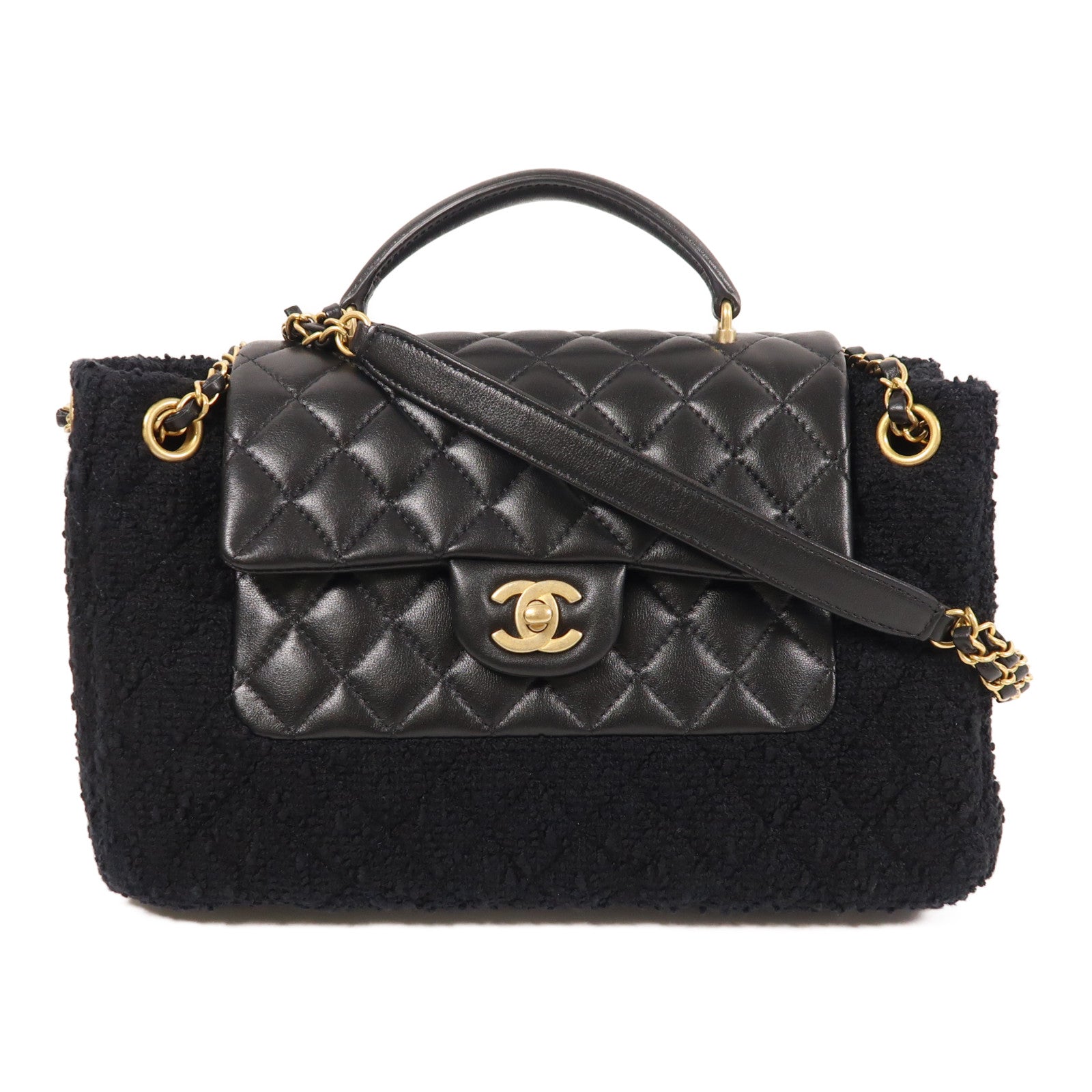 CHANEL 牛皮皮革/粗花呢2 Way Shoulder金扣手挽肩背兩用袋