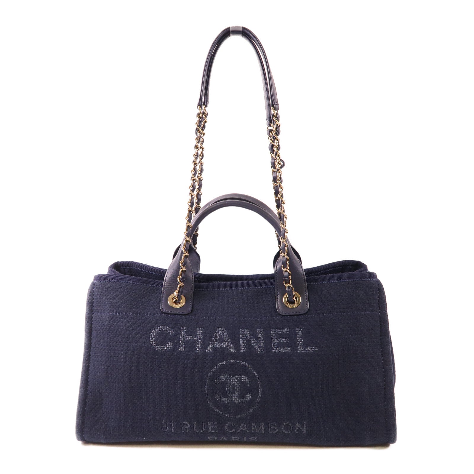 CHANEL 帆布Deauville Bowling Bag金扣鏈帶手挽肩背兩用袋