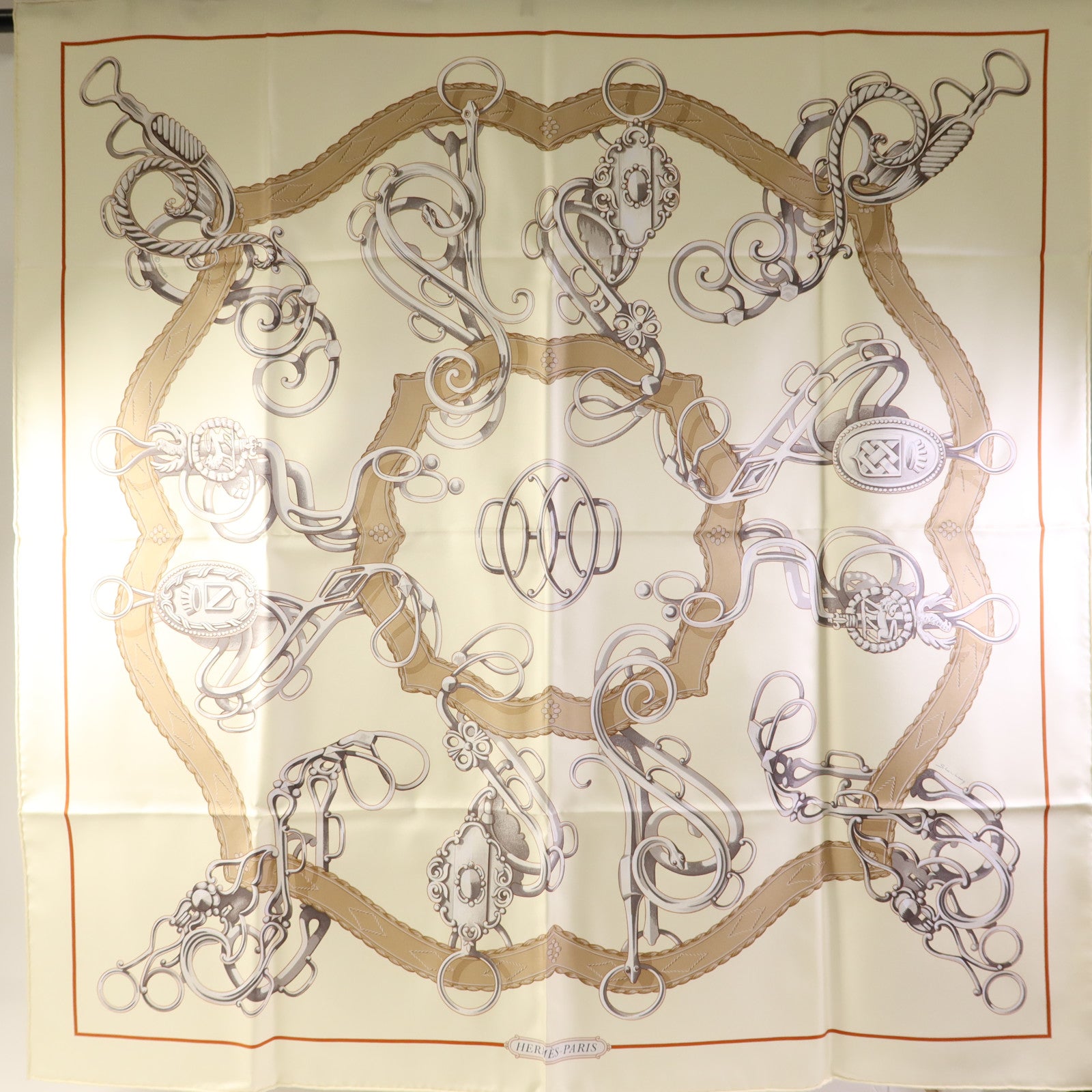 HERMES 絲質Scarf 90X90絲巾Brown/White/Beige