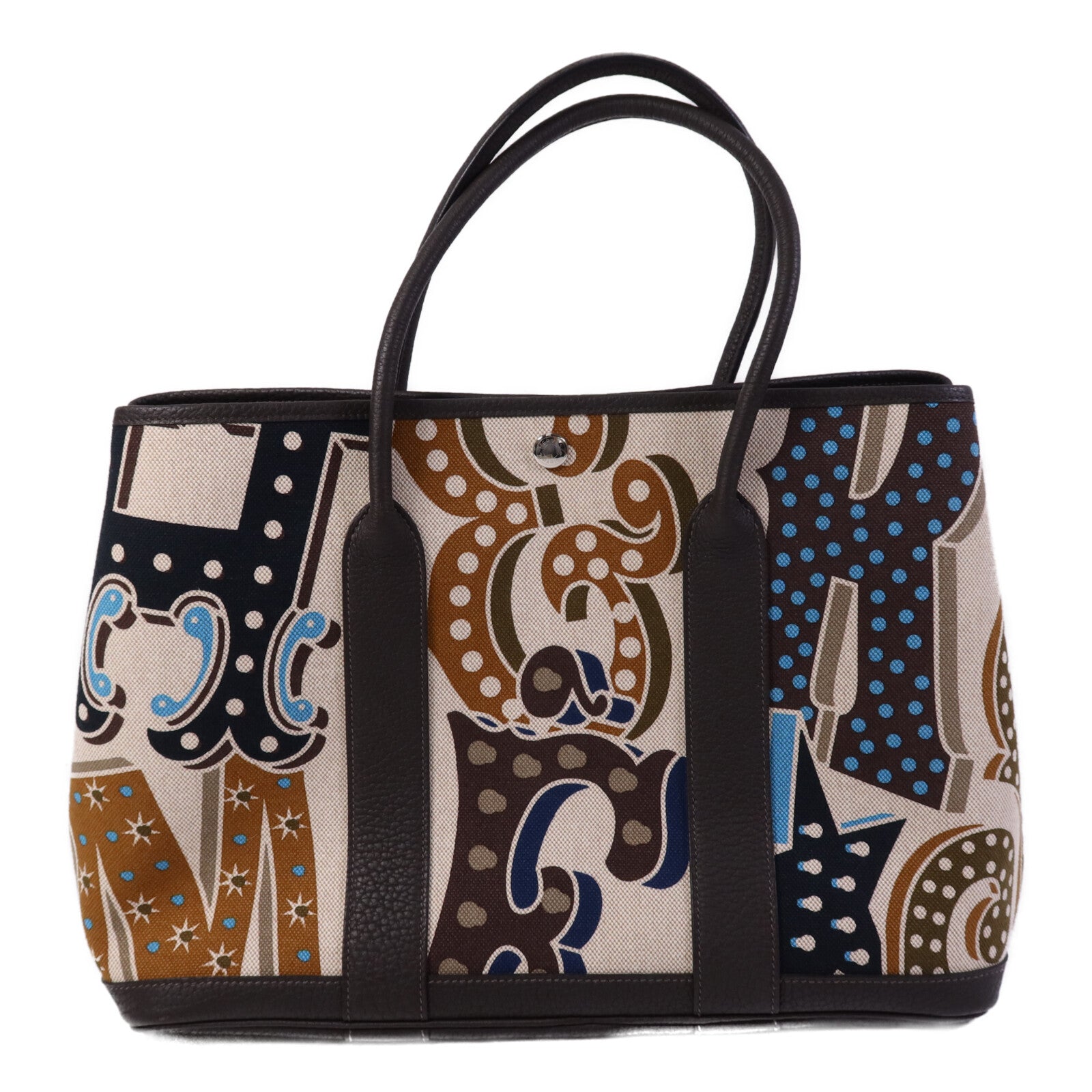HERMES Toile H/Negonda皮革Garden Party PM銀扣手挽袋Ebene/Beige/Ecru