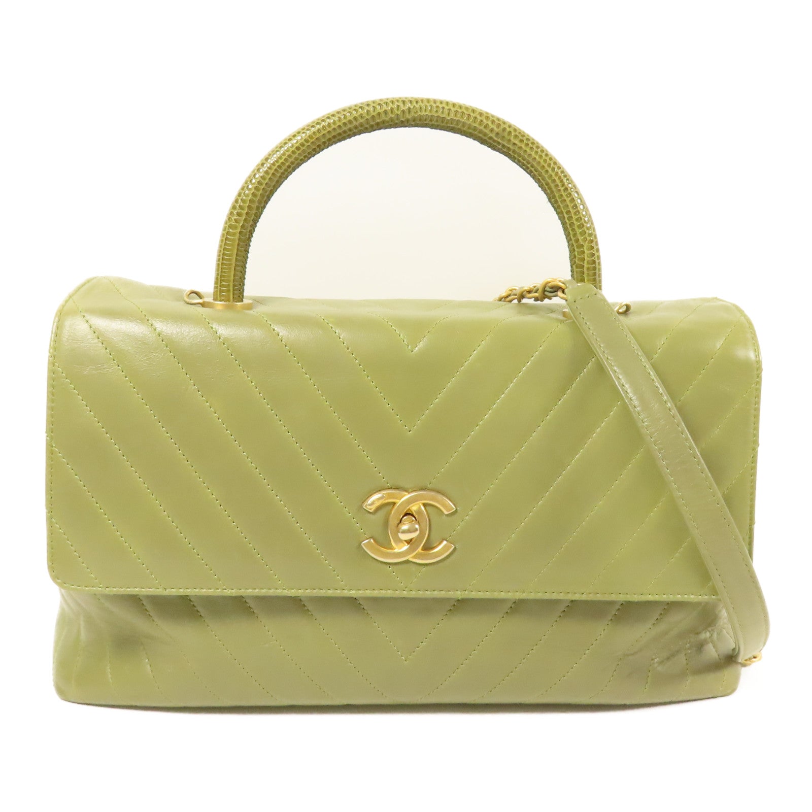 CHANEL 牛皮皮革/蜥蝪皮革Coco Handle Large金扣鏈帶手挽肩背兩用袋